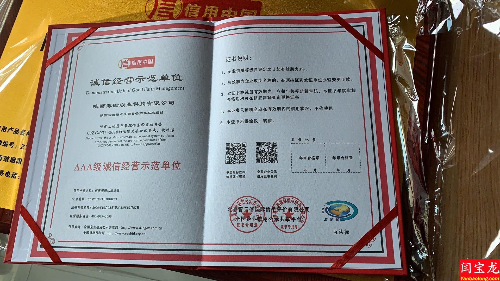 好消息!恭喜陜西博瀚農業科技有限公司獲得“信用中國”認定為3A級信用企業。大家都知道“信用中國”網站(以下簡稱網站)是政府褒揚誠信、懲戒失信的窗口,主要承擔信用宣傳、信息發布等工作,使用社會信用體系建設部際聯席會議成員單位提供的對社會公開的信用信息。網站由國家發展改革委、中國人民銀行指導,國家公共信用信息中心主辦,并由國家信息中心、中經網提供技術支持。本次陜西博瀚農業科技有限公司獲得7個證書及一個信用等級認證銅牌,還有一份關于陜西博瀚農業科技有限公司的信用評估報告。